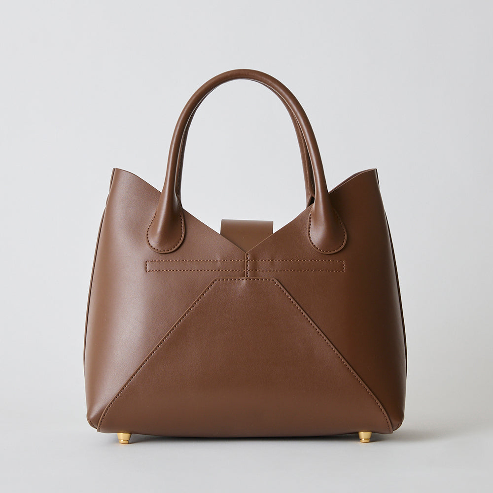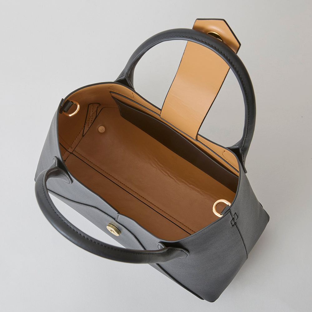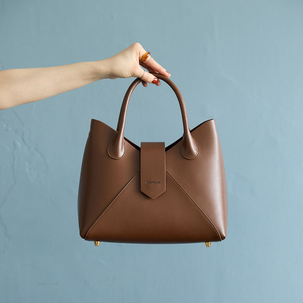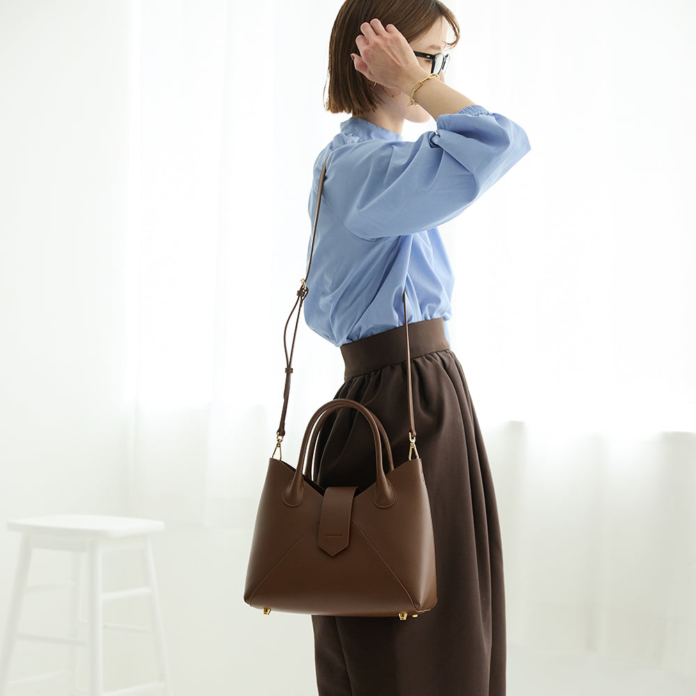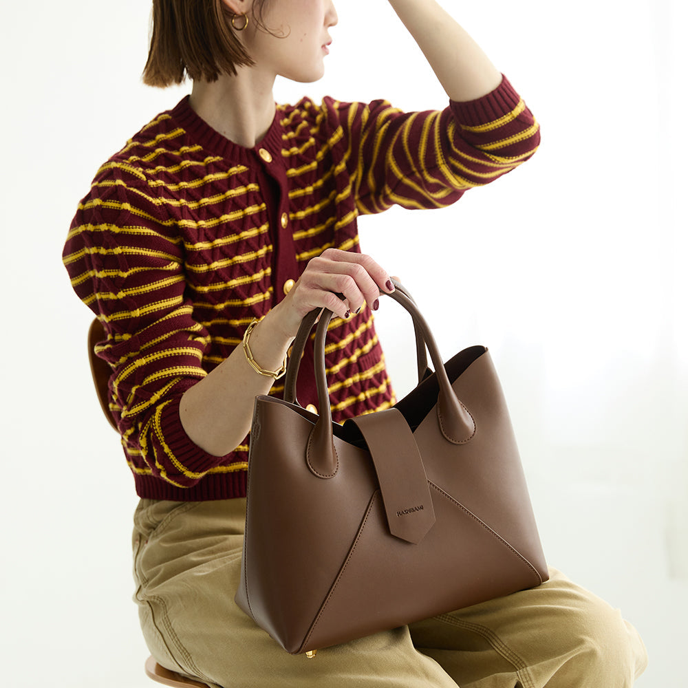 ワイドなシルエットでシンプルなたたずまいが魅力のハンドバッグ。