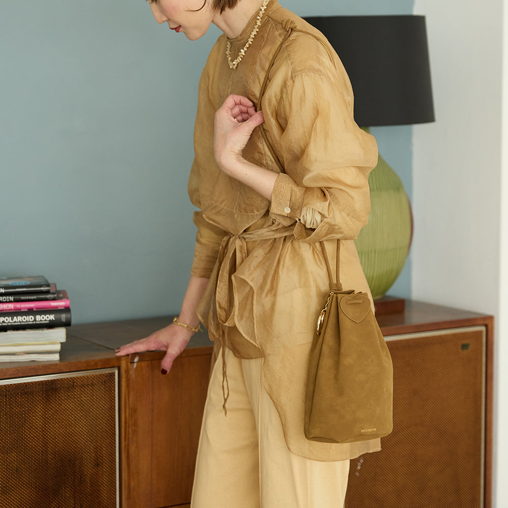 ショルダーは本体と同素材の細めのレザーコードを採用し、バッグ正面の紐留めにはさりげなくハートモチーフをオン。